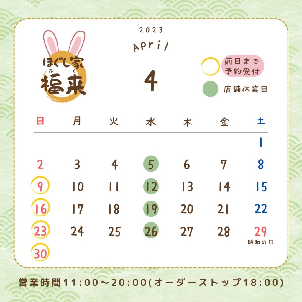 4月の営業カレンダーが出来ておりますので画像をご参考ください。