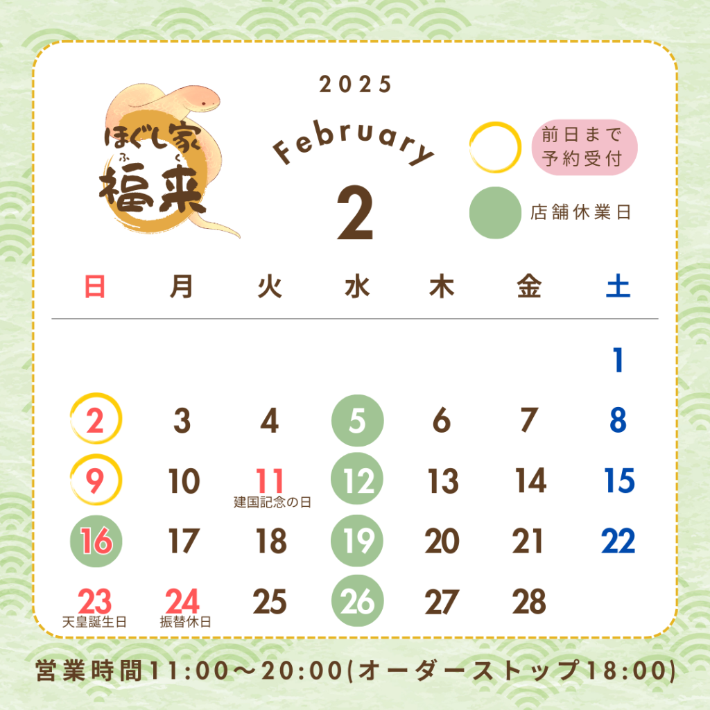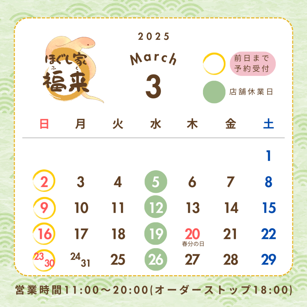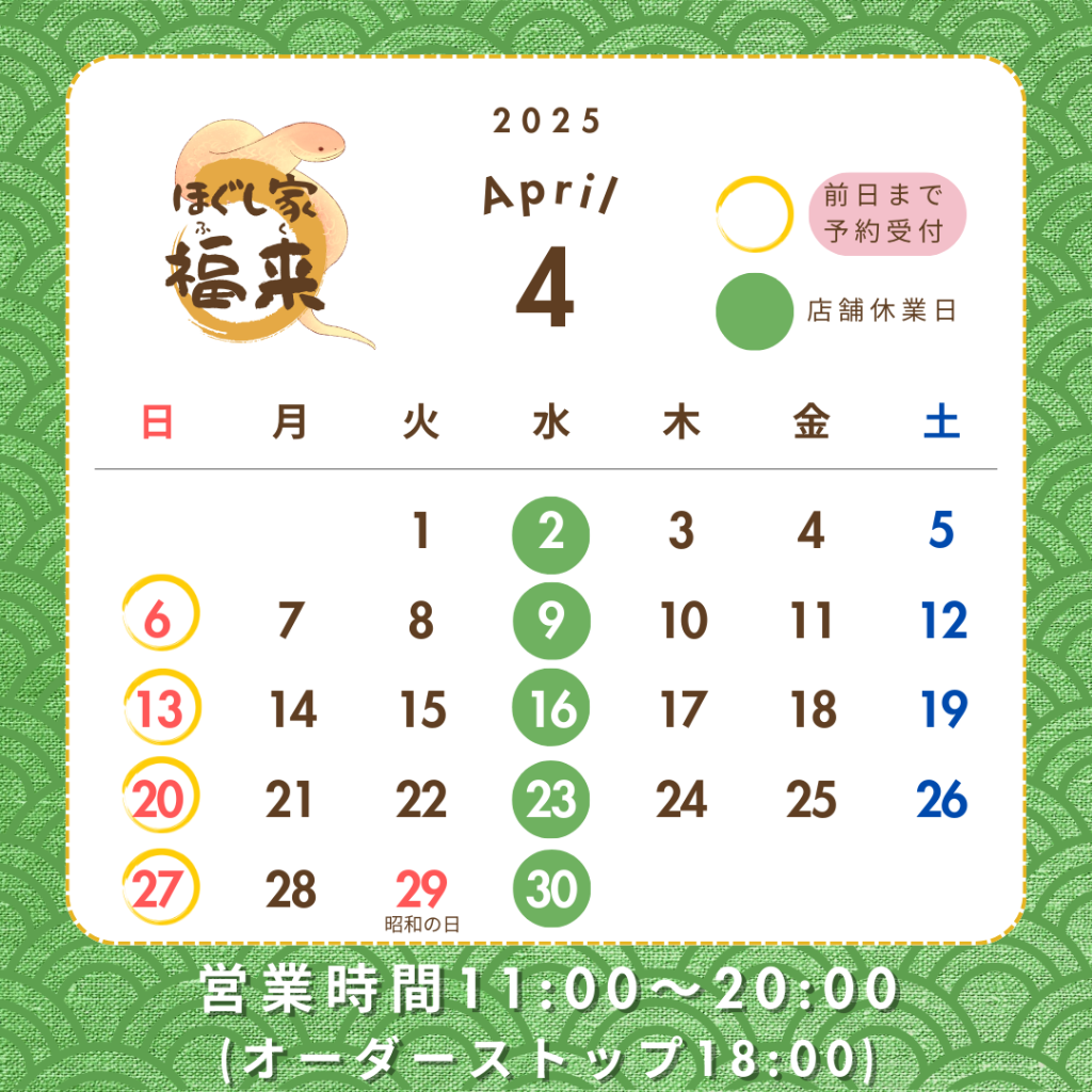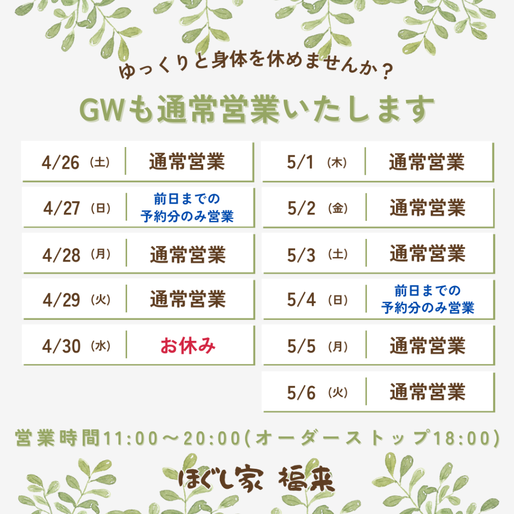 ほぐし家福来は、GW期間中も通常営業いたします。
