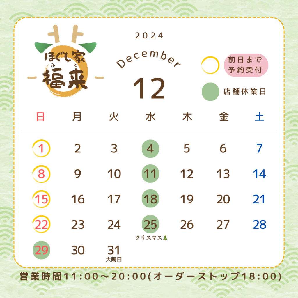 ◆年始は1月1日(水)〜3日(金)までお休みをいただき、1月4日(土)から通常営業いたします。