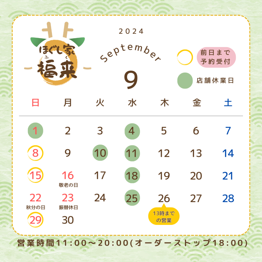 🎑9月の営業カレンダーが出来ました!