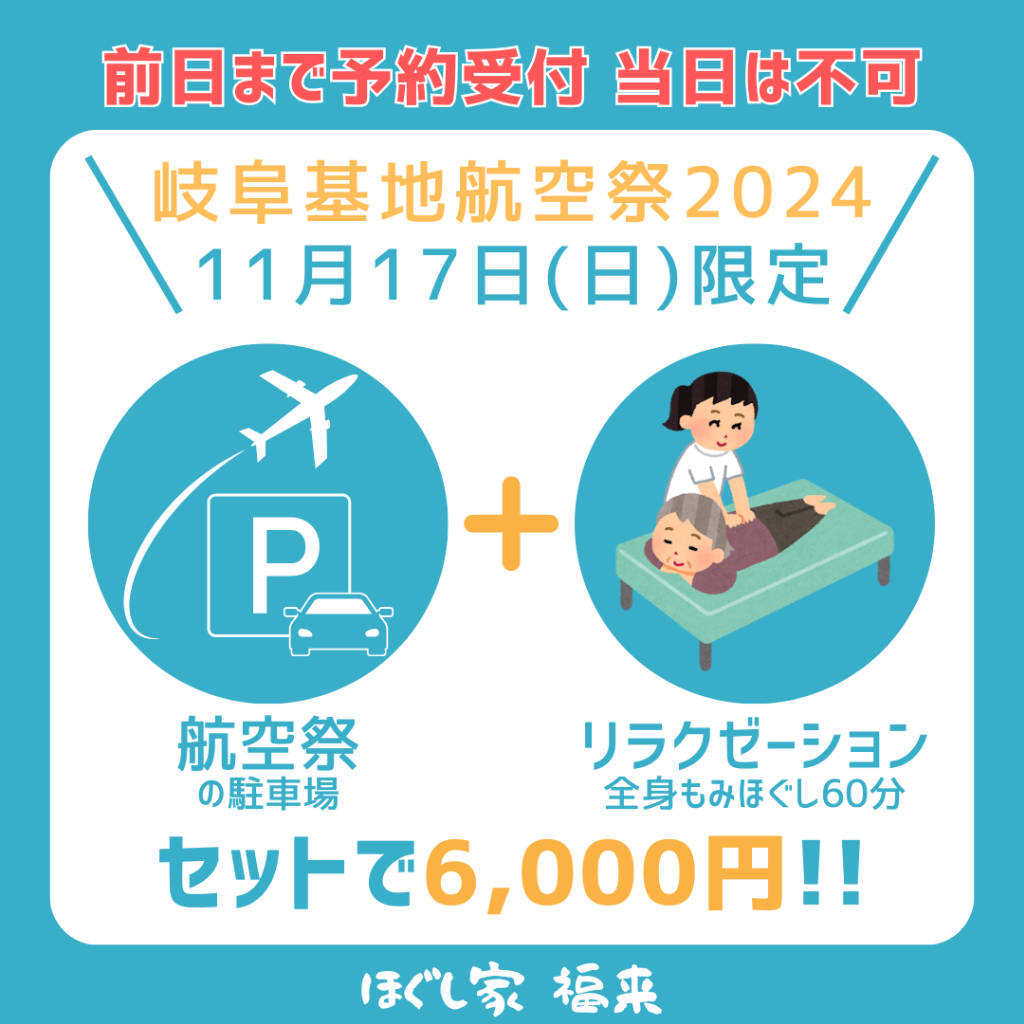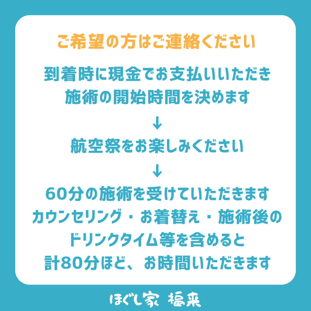 休みと言いつつも、遠方から航空祭を見に来られる方向けに駐車場代込みのリラクゼーションクーポンを出そうと考えております。