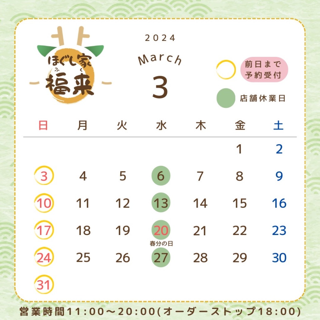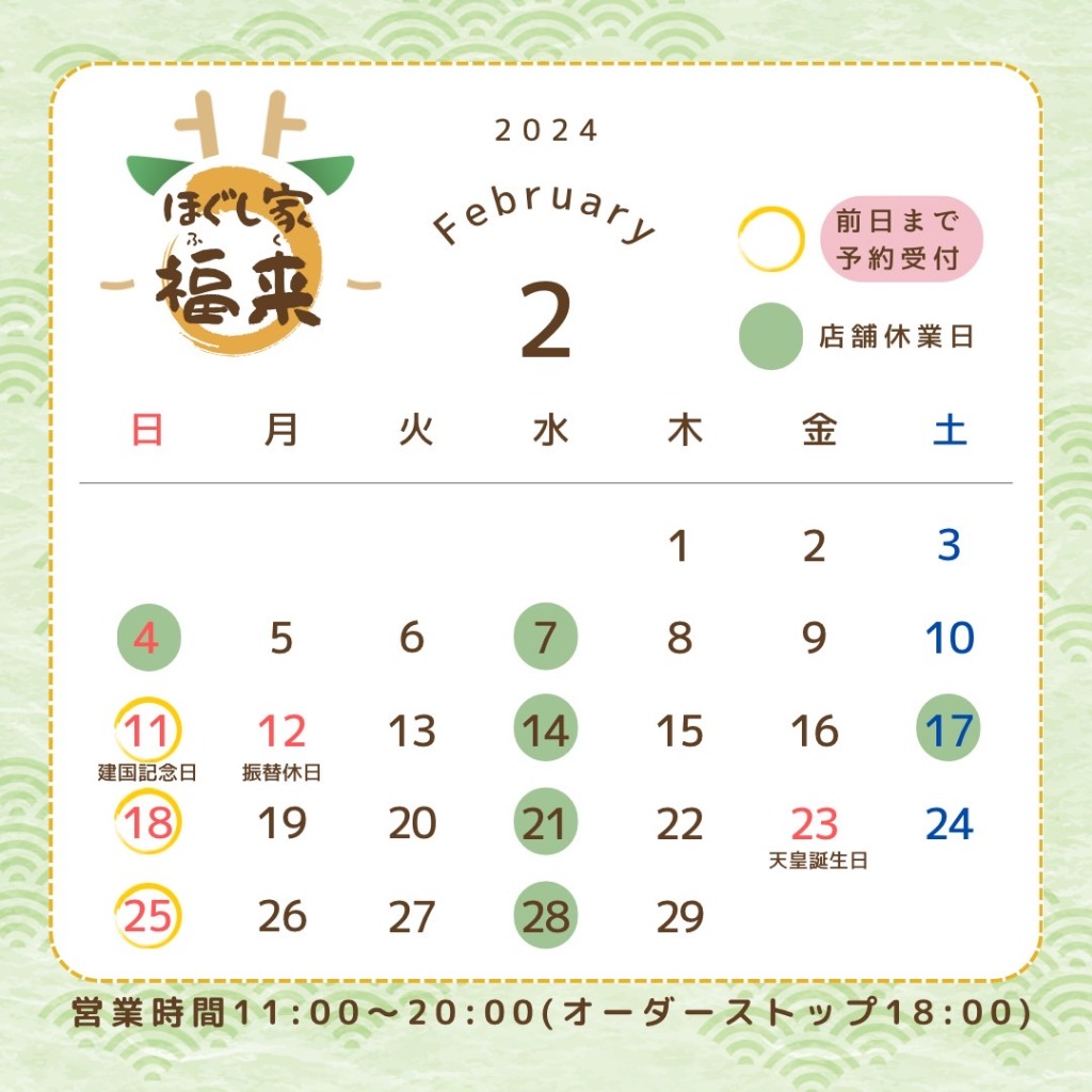 当店は水曜日が定休日・日曜日は前日までのご予約分のみ営業とさせていただいております。