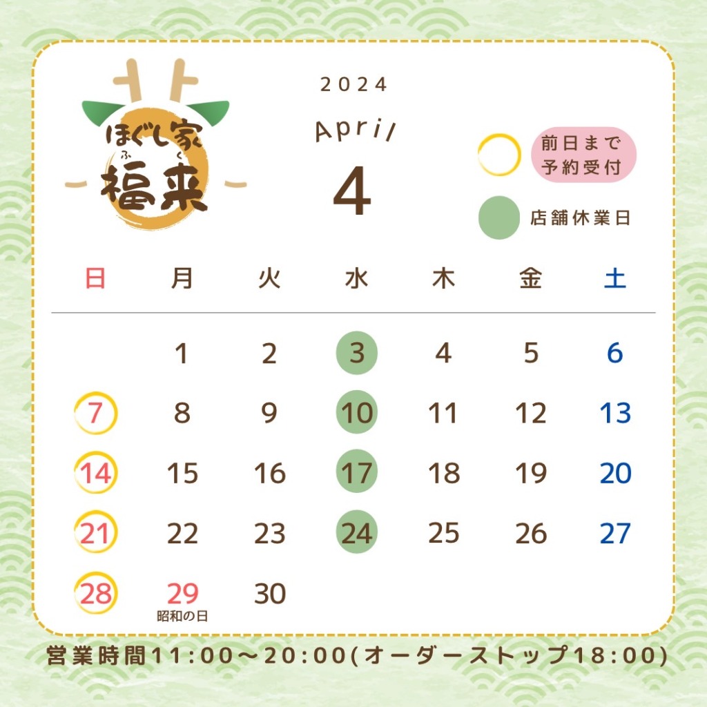 4月の営業カレンダーが出来ました、画像をご覧ください。